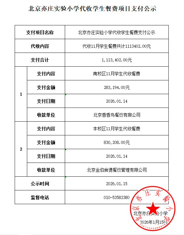 北京亦庄实验小学代收学生餐费项目支付公示